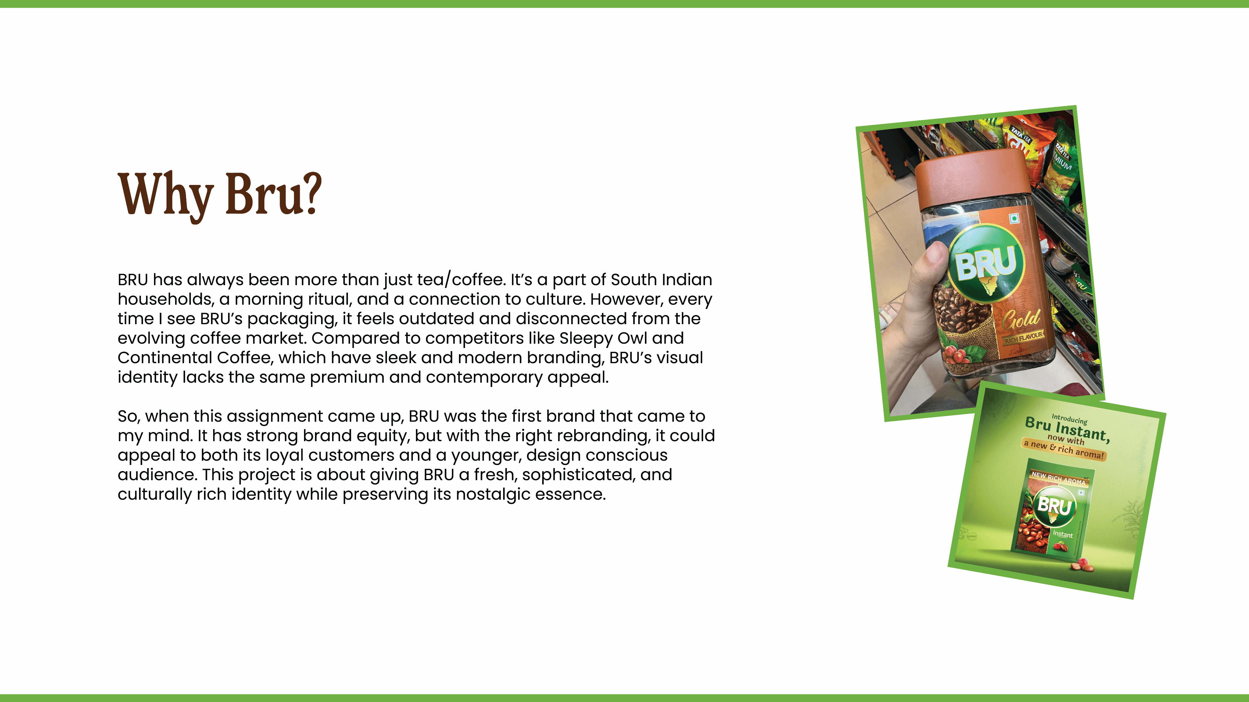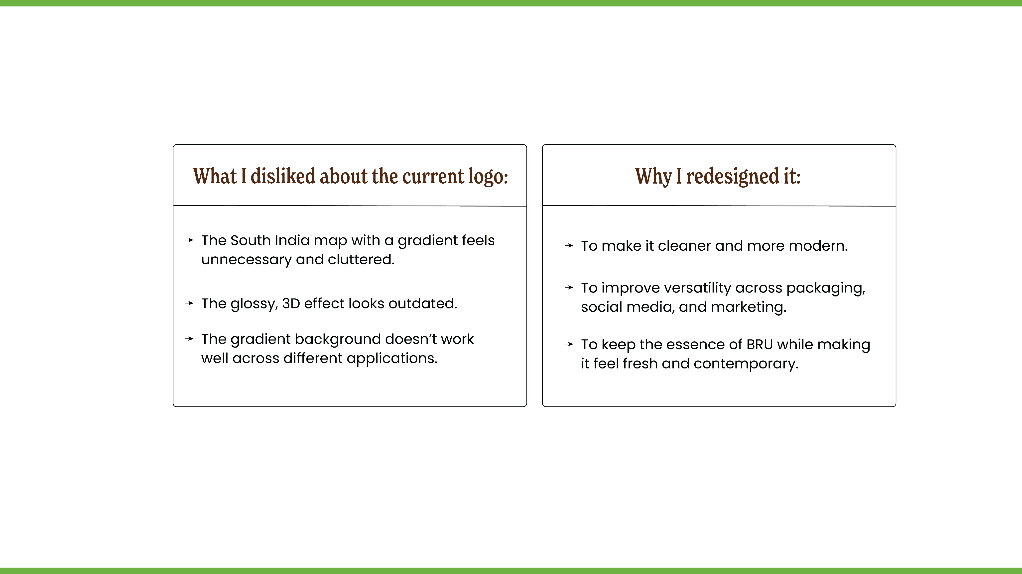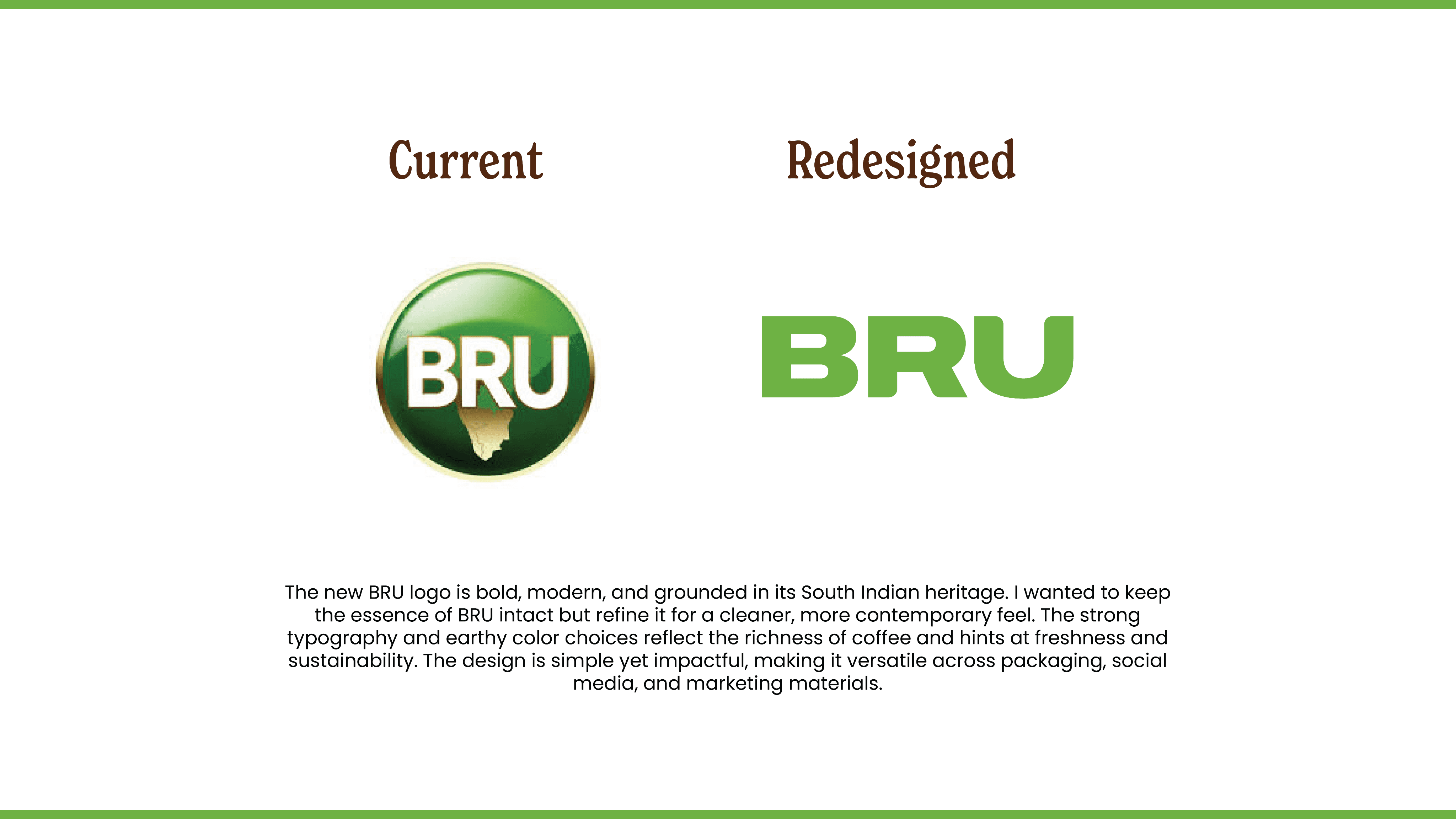As one of India’s most iconic and household-recognized brands, Bru carries immense cultural weight but faced a widening gap with modern aesthetic sensibilities. This rebranding project focused on a "modern revamp" that honors the brand's heritage while introducing a contemporary visual language. The result is a sophisticated, updated identity designed to resonate with a new generation of coffee drinkers without losing its familiar warmth.