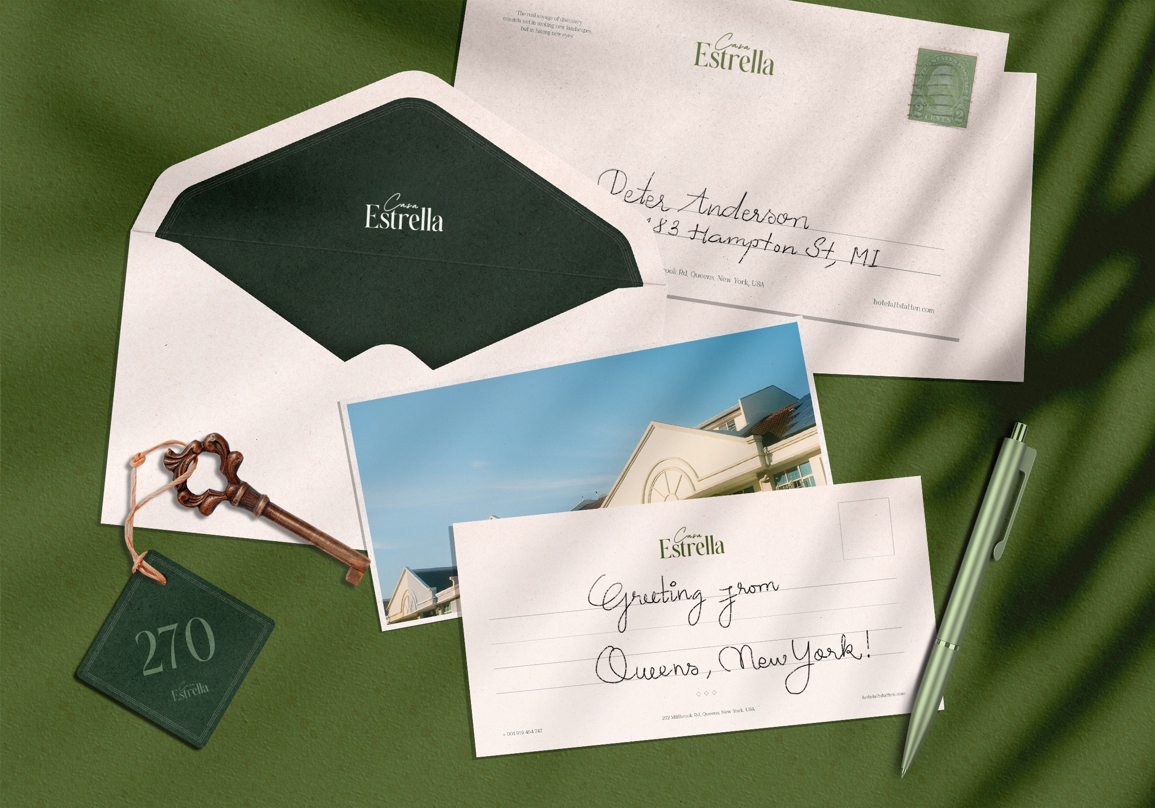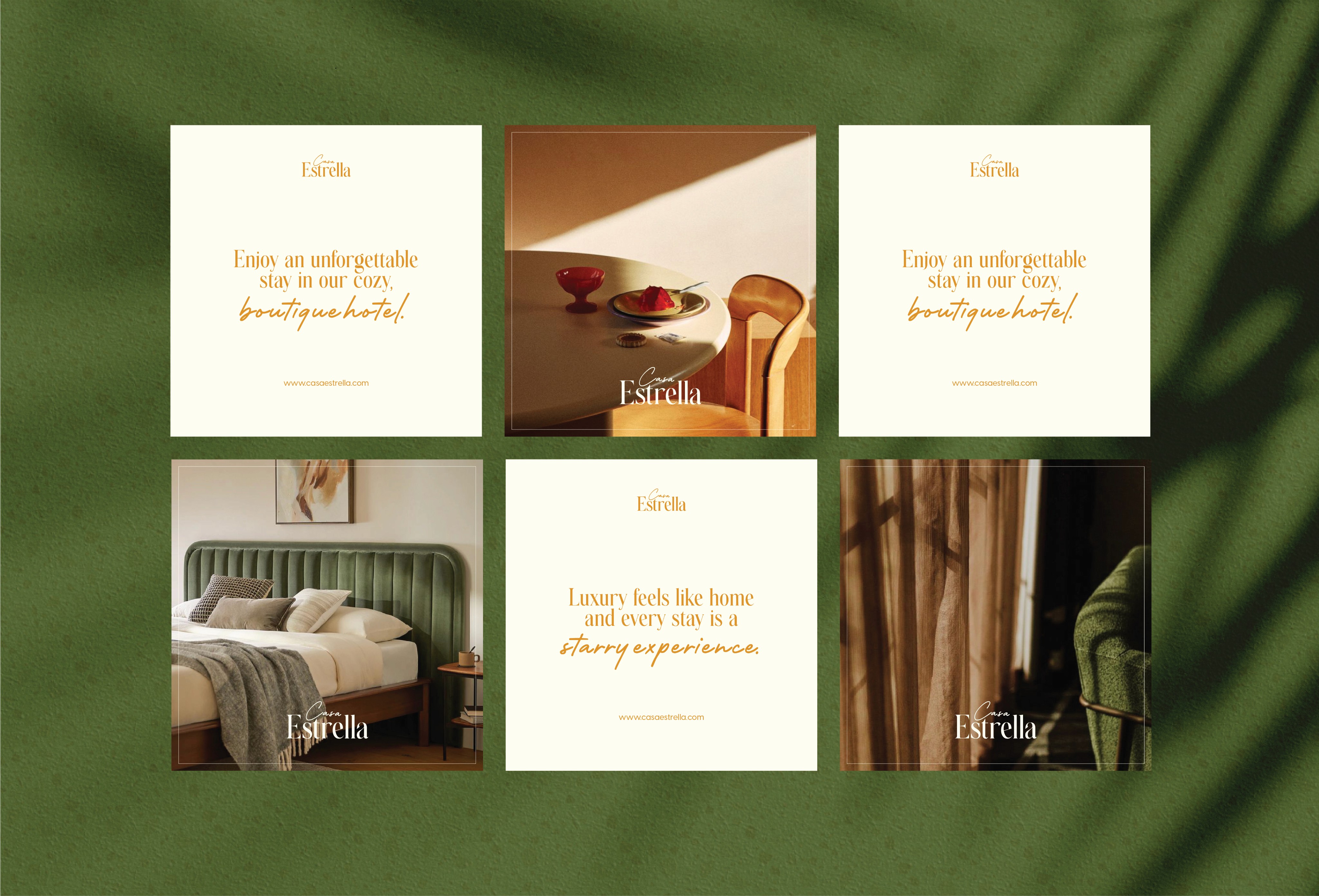 Casa Estrella is a branding project for a boutique hotel that balances luxury with a distinct, inviting atmosphere. The visual identity was crafted to reflect an artisanal and sophisticated "vibe," ensuring that every touchpoint, from the logo to the environmental cues, contributes to an immersive guest experience that feels both exclusive and residential.