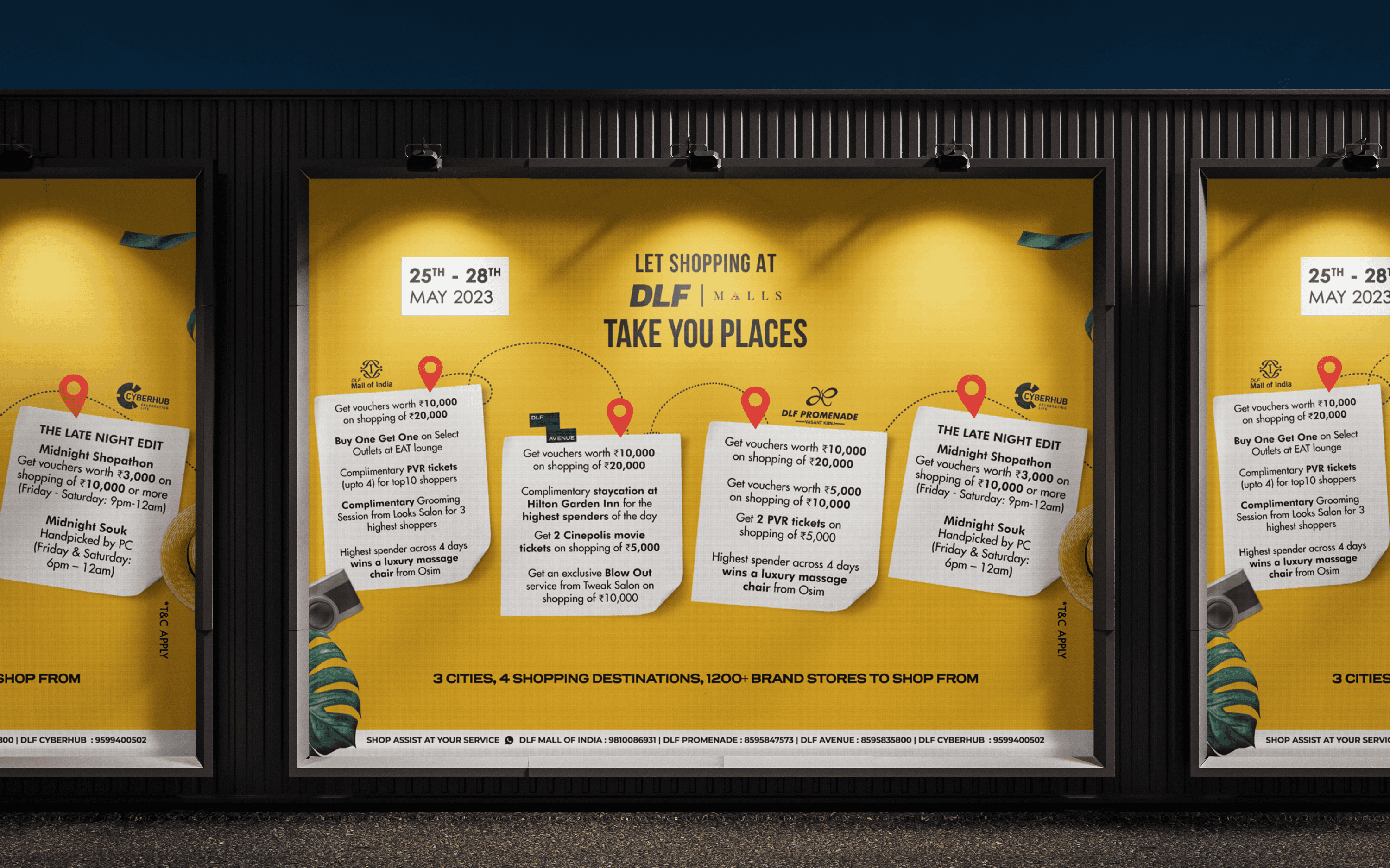 For my marketing and ad design project with DLF Mall of India, DLF Avenue, DLF Promenade, and DLF CyberHub, I created a series of vibrant and engaging campaigns for their Shopping Carnival, End of Season Sale, Food Festival, and Holiday Shopping events. Each design was tailored to capture the unique essence of the mall’s identity while maintaining a cohesive brand presence across different platforms.