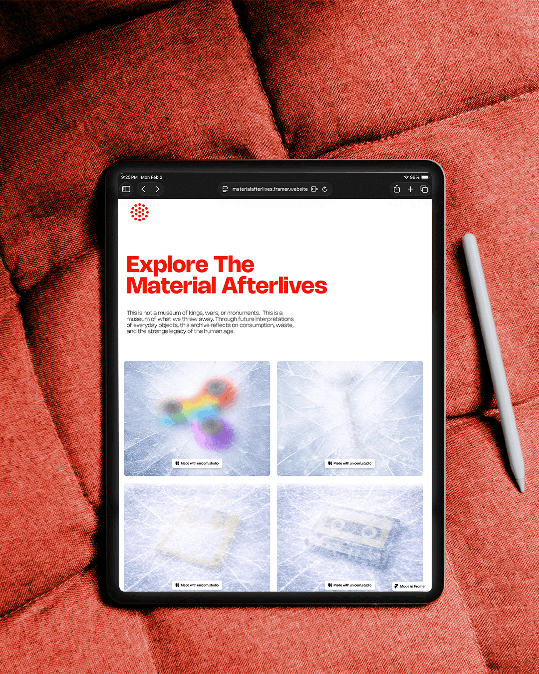 Material Afterlives is a speculative design project and digital experience set a century into the future. It reimagines our era’s most over-produced and over-consumed objects from fidget spinners to vintage gaming consoles, as mysterious archaeological "artifacts." By stripping these items of their modern context, the project serves as a stark commentary on the Anthropocene, challenging viewers to confront the environmental legacy of mass production and the fleeting nature of consumer trends.